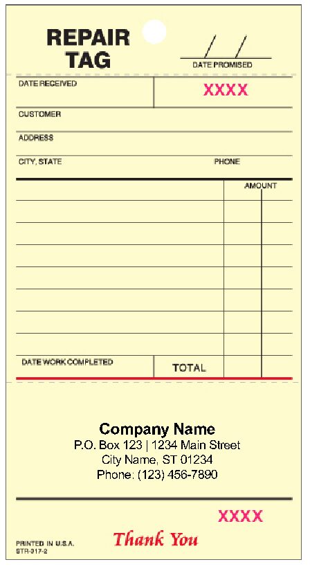 This Repair Tag is custom printed with your company information and logo. This tag has a detachable claim check. Attach the tag to any product received for service and hand the claim check to your clients. Both the tag and claim check have the option to add sequential numbering for easy product recovery.